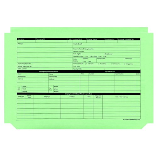 High quality personnel wallets perfect for creating detailed files on all of your employees, streamlining your HR division for added efficiency. Each wallet is pre-printed on both sides with employee name, address, salary record and more, for creating an organised and practical filing system.